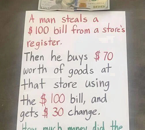 Here’s the challenge: A guy steals a $100 bill from a store’s cash register. Then, he uses that stolen $100 to buy $70 worth of stuff at the same store and gets $30 in change. How much money did the store actually lose?